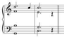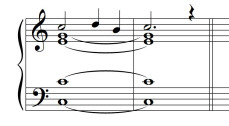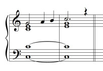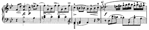 위의 악보 예에서 소프라노의 C음이 2도 하행하여 B 음으로 내려가 불협화가 된 후에 반대 방향으로 도약하여 E음으로 협화 음정을 이루었습니다 여기에서 B음은 일반적으로 약박에 나타납니다 아래에 모짜르트의 피아노 소나타 10번(K.333)의 1악장의 한 부분에서 그 예를 보여 드립니다
