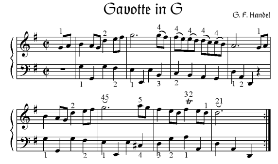 헨델이 사장조의 가보트(HWV 491)에 사용한 선행음의 예를 보여 드립니다