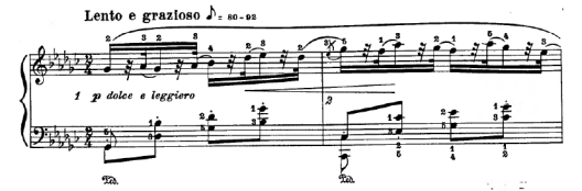 둘째 마디는 전체가 IV도 화성 하나로 되어 있는데 오른손 첫째 박의 F와 A플랫 음은 두 개의 G플랫 음 사이에서 이중 보조음으로 사용된 경우입니다 이것은 둘째 박에서 위치를 약간 바꾸어 한 번 더 반복됩니다