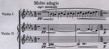 위의 악보에서 소프라노의 첫번 째 C음은 예비하는 과정이고 타이가 붙은 두번째의 C음은 계류음이 된 상태이고 마지막의 B음은 2도 하행하여 해결하는 과정입니다 계류음에는 tie가 붙어 있지 않은 경우와 붙어 있는 경우로 나누어 볼 수 있는데 앞에 보여 드린 헨델의 가보트의 셋째 마디에서 연속으로 나오는 8분 음표 사이에 등장하는 경우는 tie가 붙지 않은 경우이고 아래에 보여 드리는 사무엘 바버의 현을 위한 아디지오에서는 tie를 사용한 경우 입니다(아래 악기 악보 생략)