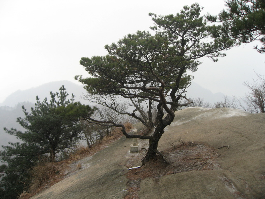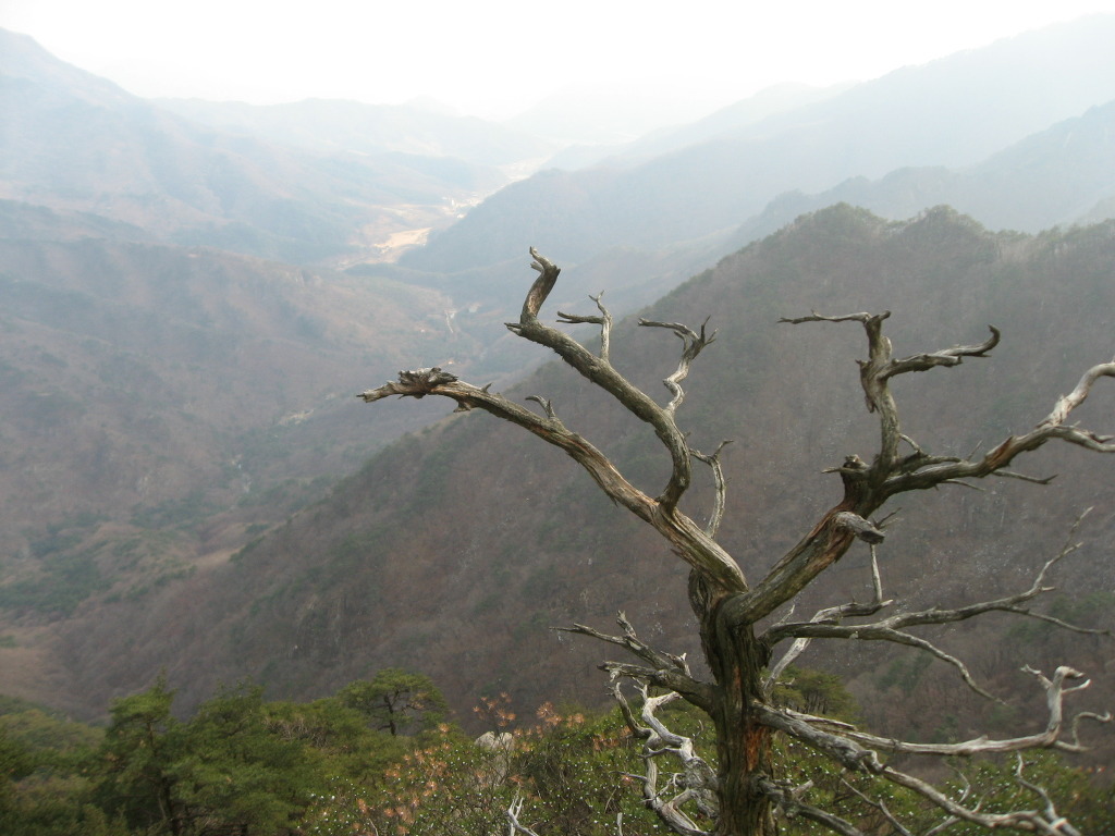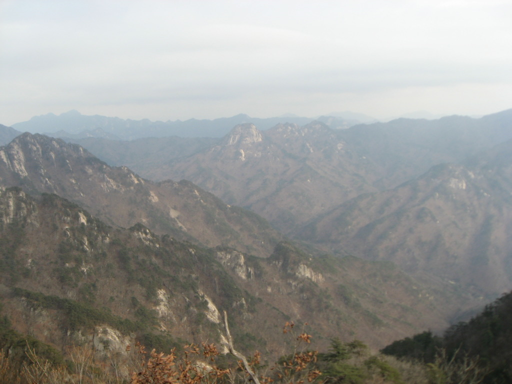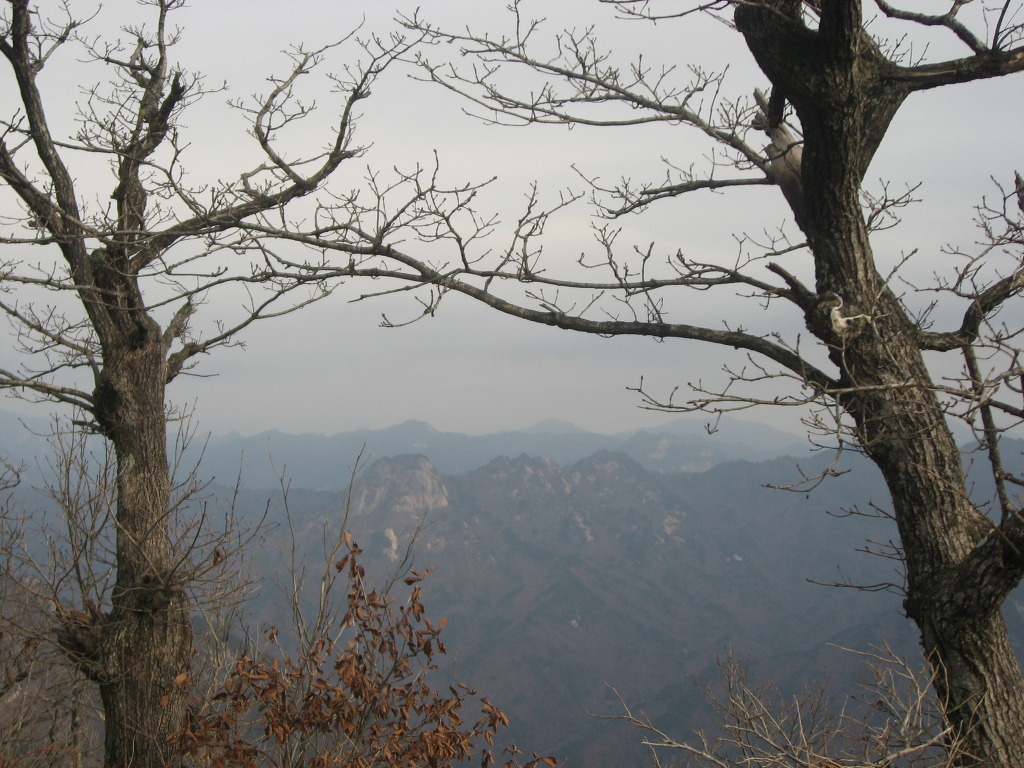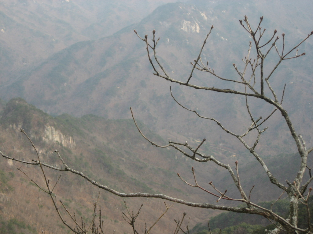 샘터에서 잠시 쉬었다가 식수를 다시 점검하고 경사가 급한 소나무숲과 참나무숲을 지나 능선길에 올라서면 시야가 탁 트인 1005.8봉인 헬기장에 도착하는데 사방이 시원하게 뚫려 참나무가 일부 가려있는 정상보다 전망이 좋으며 샘터에서 이곳까지는 약 20분정도의 시간이 걸린다.