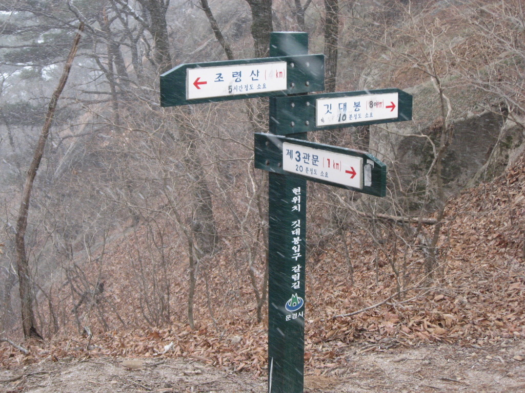 조령산 정상에 서면 북쪽으로 그 위세를 자랑하면 우뚝 우뚝 서있는 봉들에 매료돼 마음까지 요동치기 시작한다. 차분한 마음으로 정상표지석을 뒤로한 채 대간길을 따라 100m 정도 내려가면 오른쪽으로 90도 급경사 낭떠러지와 왼쪽으로 제3관문이라 적힌 이정표가 있는 넓은 길이 나온다. 왼쪽길을 택해야 하며 아무런 표시가 없는 오른쪽은 자칫하면 엉뚱한 길로 빠질 수가 있으니 유의한다. 조금 더 앞으로 나가면 잘록한 안부가 나타나고 마루금에서 좌·우로 빠지는 길이 보인다.