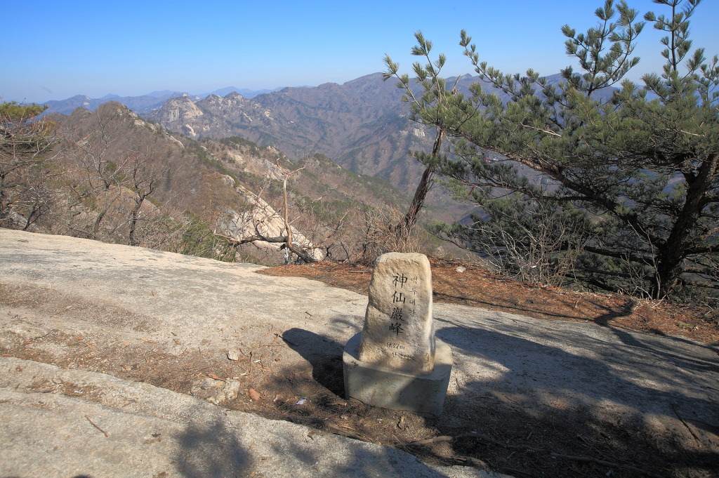 산행에 서툰 사람은 이곳에서 로프를 잡고 서서 지나지 말고 말을 타듯 바위를 타고 앉아 줄을 잡고 앞으로 진행하면 훨씬 편하고 안정적이다. 칼바위를 지나면 이번에는 길게 경사진 슬랩구간으로 로프가 있으며 이곳을 오르면 잡을 곳이 없고 1m가 넘는 단을 오르며 바위 밑을 통과해야 한다. 신선봉을 오르면서 로프있는 직벽 5m 구간도 있다. 신선봉 정상은 평탄한 바위 쉼터이며 나무에 걸린 3관문,절골,수옥폭포로 가는 이정표가 있다.