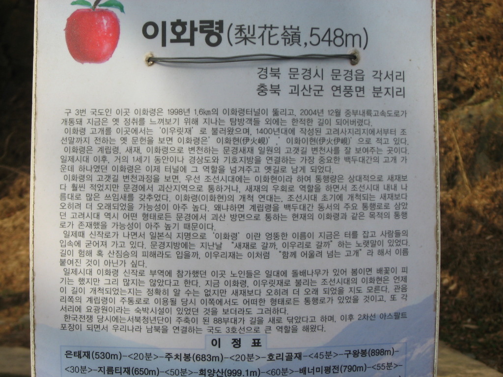 이화령에서 조령산을 거쳐 조령까지의 산행길은 백두 대간 줄기이다. 이 코스의 종주시간은 이화령에서 출발을 기준으로 대략 5시간 정도이다.