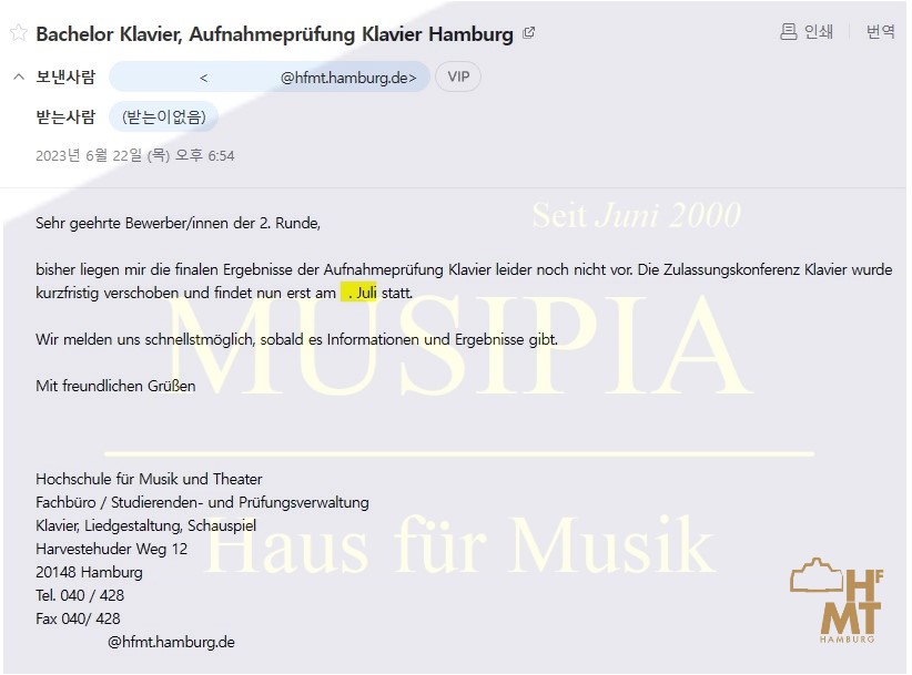 Hamburg 국립음대 1차시험(Vorauswahl)에 합격 후