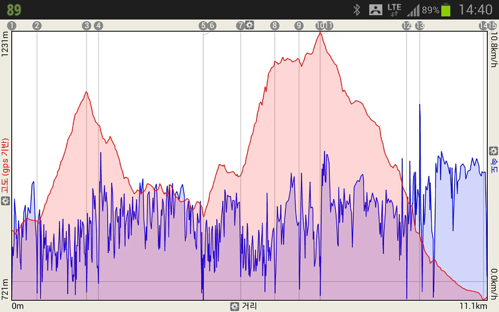 산행거리 : 11.1km[gps측정] 평균이동속도[2.97km/h]