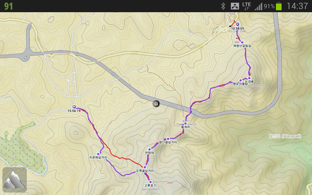 적색선은 예상경로 보라색은 실제 산행경로