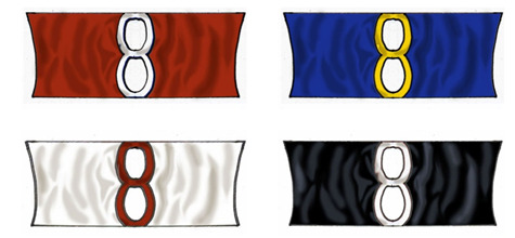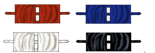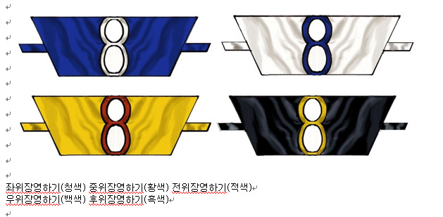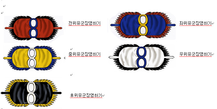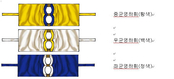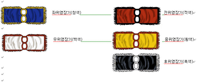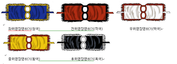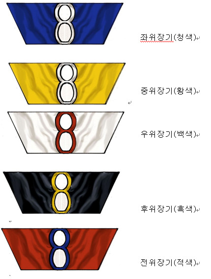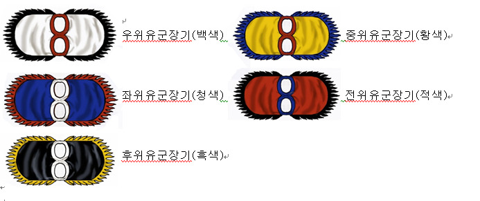 좌위장(청색바탕) | 중위장(황색바탕) | 전위장(적색바탕) | 우위장(백색바탕) | 후위장(흑색바탕) |