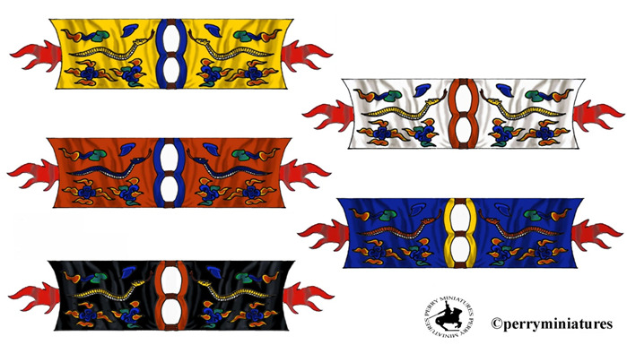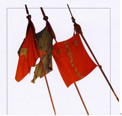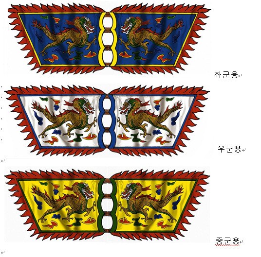 좌군은 청색 바탕, 우군은 백색 바탕에, 중군은 황색 바탕이다. 각각 용과 구름을 그려 넣었으며 불꽃 깃술이 달렸다.