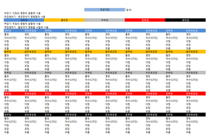 삼군중 좌군대장 휘하 병력구성을 정리해봤습니다. 여수장은 백인대장 정도가 되려나요.