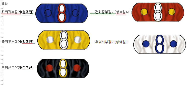 중위좌부장기(청색원) 중위중부장기(황색원) 중위전부장기(적색원) 중위우부장기(백색원) 중위후부장기(흑색원) |