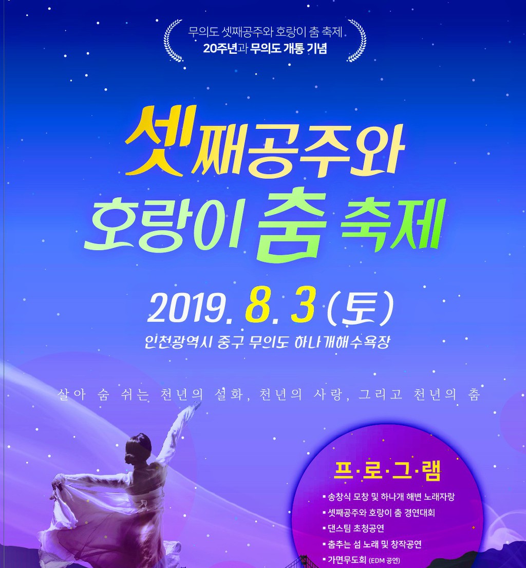 제20회 무의도 셋째공주와 호랑이 춤 축제의 하이라이트라고 볼 수 있는 춤 경연대회가 8월 3일 하나개 해수욕장에서 열립니다.