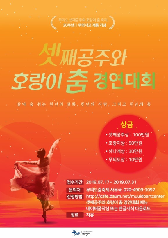 제20회 무의도 셋째공주와 호랑이 춤 축제 춤 경연대회 포스터 작성자무의도춤축제|작성시간19.07.18|조회수214 목록 댓글 0 글자크기 작게가 글자크기 크게가 다음검색 현재 게시글 추가 기능 열기 북마크 공유하기 신고 센터로 신고 댓글 댓글 0 댓글쓰기 댓글 리스트
