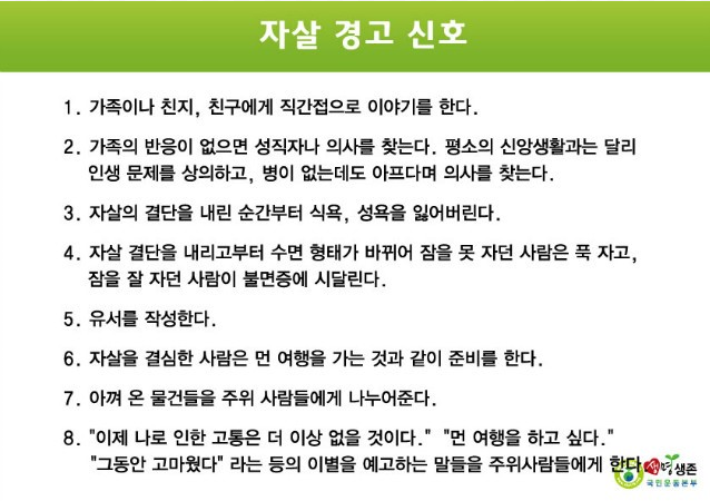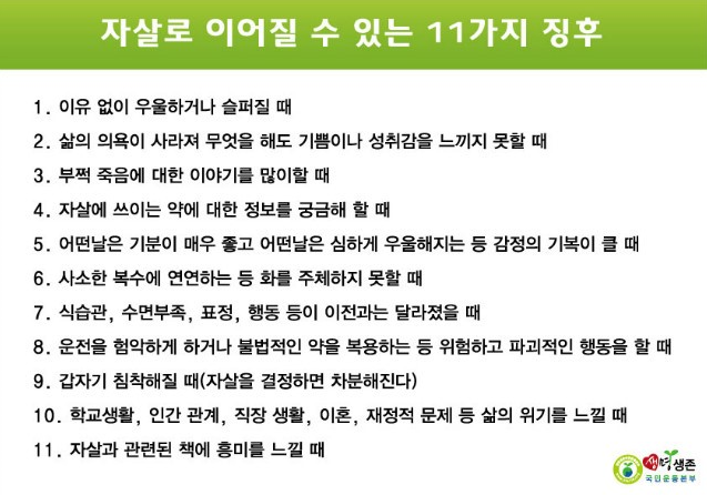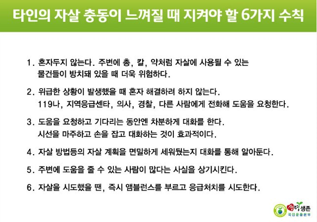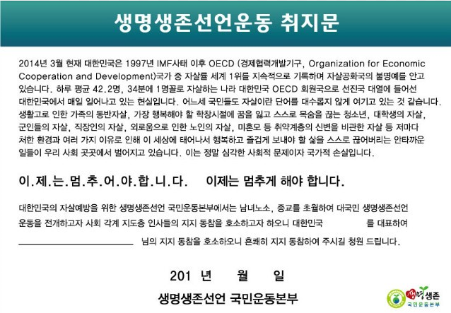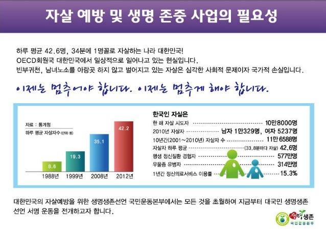 자살예방 및 생명존중 문화 확산을 위한 생명생존 온라인 서명에 동참 해 주세요.