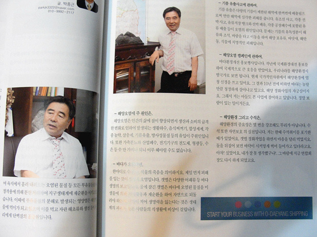 (주)오대양 선박을 창업하여 해양폐기물,토적오염물질 수거 및 어장정화정비,해상화물운송,항만용역,항만하역업을 운영하는 바다와 사람이