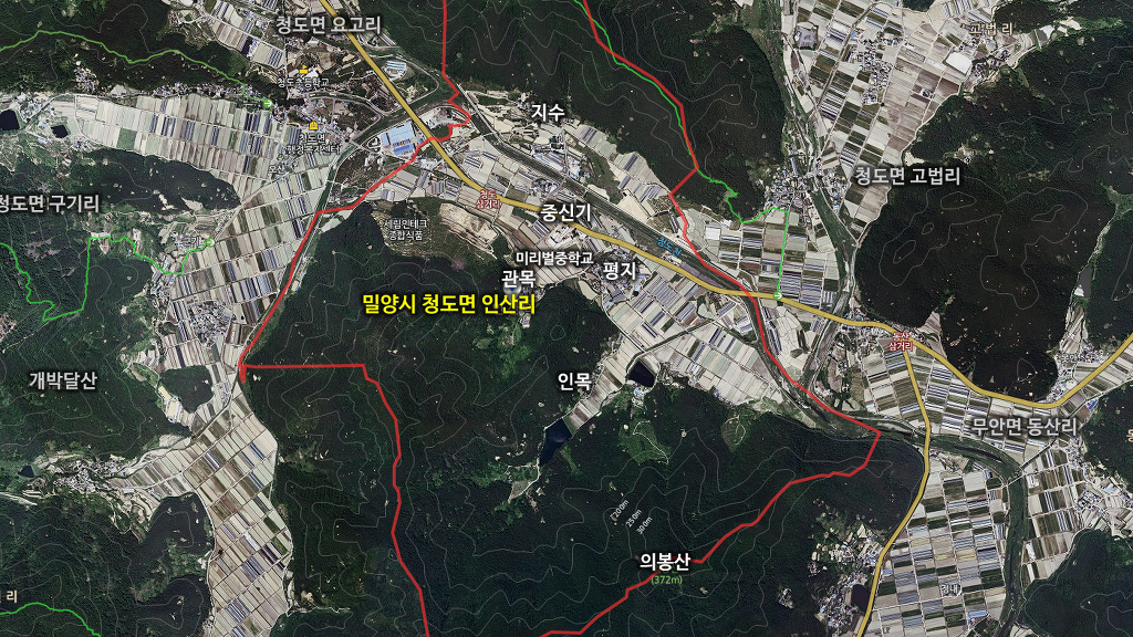 뒤로는 조천리의 지불등이 동남으로 뻗어 내려와 한 줄기는 건질미산에 이르고, 또 한 줄기는 어봉산(魚鳳山)에 이른다. 그 사이에 인목(仁牧), 관목(冠牧), 평지동(平地洞) 등이 있고, 어봉산 아래에 용포동(龍浦洞)이 있다. 북으로는 호암산의 산줄기가 내려와 죽바우산에 이른다. 이 산 아래쪽에 지수동(智水洞)이 있다. 그 사이에는 주위의 여러 마을에 내려온 하천이 모여 청도천을 이루어 무안면으로 흘러 간다. 이 하천을 중심으로 평야가 발달되어 있다. 이 주위에 중신기, 상신기 등이 있다. 동.서로 탁트인 마을이다. 지금도 24번 국도가 마을의 한가운데를 통과하여 동.서로 달리고 있다.