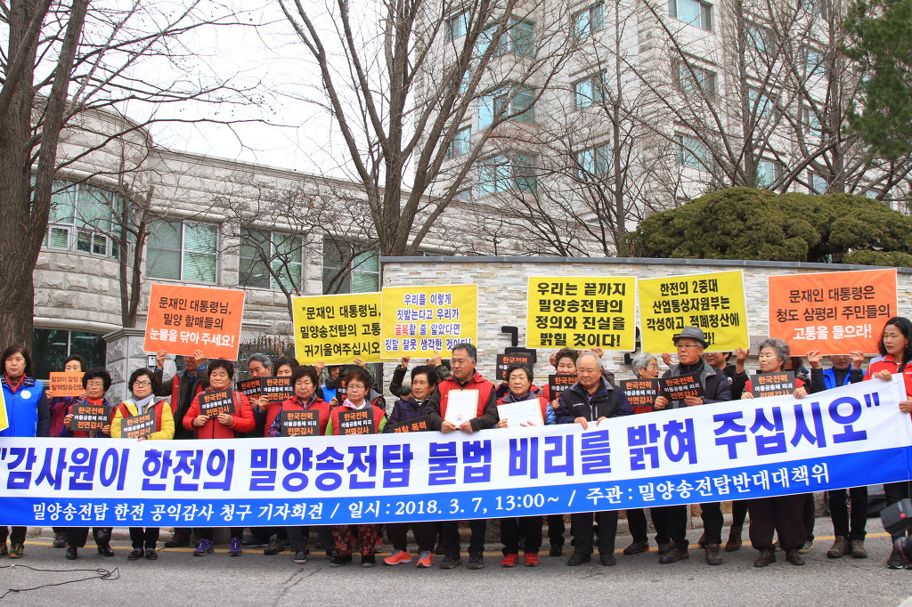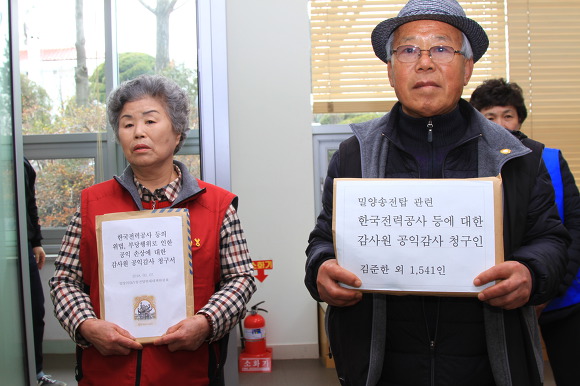 밀양 주민 40여명은 오후 13시 30분, 감사원 정문 앞에서 ‘밀양송전탑 한전의 비리 관련 감사원 공익 감사’를 청구하는 기자회견을 가졌다. 이번 공익감사 청구에는 밀양 주민과 전국 연대 시민 1542명이 참여했다.