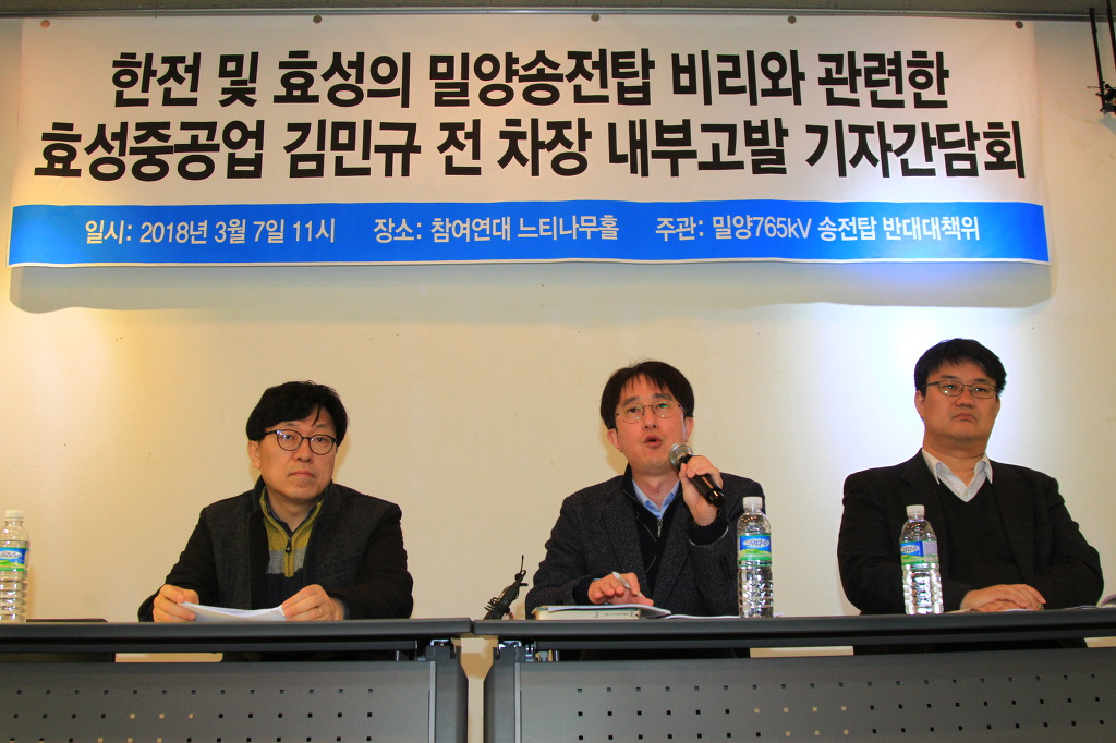 밀양송전탑반대대책위는 오늘 11시, 참여연대 느티나무홀에서 주민 40여명이 참석한 가운데, 효성중공업 전력영업팀에 근무하다 내부 비리를 해결하기 위해 노력하다 2015년 부당해고된 뒤 한국전력과 효성의 밀양송전탑 관련 비리를 고발한 김민규 전 차장의 기자간담회를 열었다.