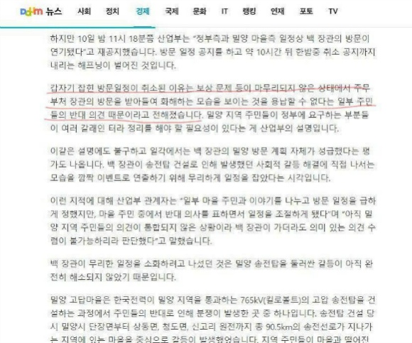 5. 더 나아가 이 기사에서 “에너지 공기업의 맏형격인 한전이 지역 갈등의 중심에 서게 된 것입니다. 산업부로서는 영국 무어사이드 원전 수주와 사우디 원전 수출 등 현안에 집중해야 하는 한전이 불필요한 갈등에 휘말리는 것을 조기에 막아야 하는 상황입니다.”는 대목은 밀양송전탑 문제 해결을 바라보는 산업통상자원부의 입장이 아닌지조차 의심스럽다.