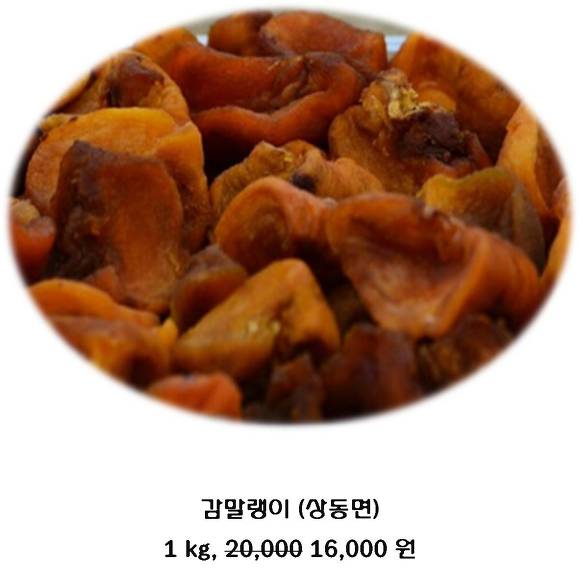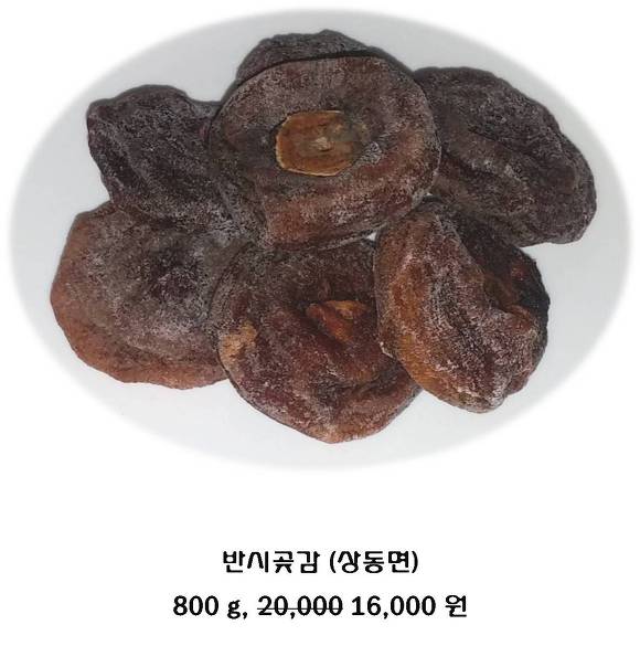상동면 고정마을에서 씨가 없는 밀양반시로 만든 달콤한 곶감입니다. 황을 처리하지 않았기 때문에 갈색이며 겉에 하얀 분이 있습니다. 납작하고 동그란 곶감이 25~30 개 들어있으며 선물용으로도 좋습니다.