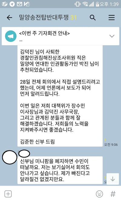 공유한 이미지는 김덕진 씨에 대한 저의 문제제기가 당사자 간 해결 중임에도 천주교 MeToo로 묶여 마구 보도되던 18년 2월말 김준한 대표가 밀양대책위 단체대화방에 올린 상황 해명 글과 그에 대한 한 주민의 반응입니다.