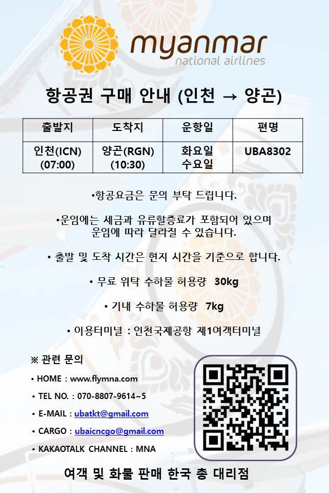 미얀마 항공 (Myanmar National Airline, MNA) 에서 인사드립니다. 저희는 인천-양곤 구간을 이용하시는 승객분들이 좀 더 편안하고 저렴하게 여행 하실 수 있는 MNA 국영 전세기 항공권을 판매하는 정식 업체입니다. 저희 MNA 항공은 이용객 여러분께 보다 더 안전하고 격조 높은 서비스를 제공하기 위해 '안전'과 '고객중심서비스'를 핵심 가치로 두고 있습니다. 타 항공사 대비 넓은 좌석 간격을 제공하며 30Kg의 무료 위탁 수화물을 허용 하고 있습니다. 매주 화요일과 수요일 인천-양곤 구간을 운항 하고 있으며, 문의사항이 있으실 경우 편하게 연락 주실 수 있도록 안내문을 함께 첨부 하오니 많은 관심과 이용 부탁 드립니다.