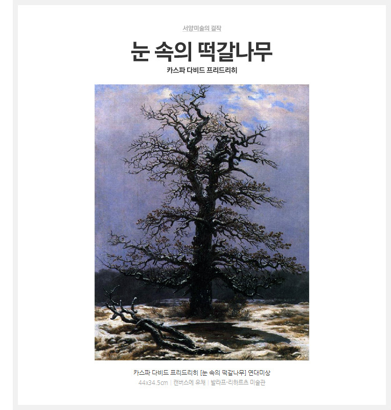 독일 낭만주의 풍경화의 거장 프리드리히는 독일인들이 가장 아끼는 화가들 중 하나이다. 그가 활동하던 19세기의 독일 화가들 대다수는 거의 열등감으로 보일 만큼 이탈리아 미술에 대한 동경이 컸다. 이들은 앞다투어 로마로 몰려가서는 박물관을 가득 채우고 있는 르네상스 대가들의 작품들 앞에서 넋을 놓은 채 모사에 열중했다. 물론 이들 중에 그 양식적인 특성을 나름대로 소화하여 개성있는 작품세계를 이룬 작가들이 없는 것은 아니나 대개는 시대에 뒤떨어진 유사품을 양산하는 데 그쳤다. 이런 상황에서 진정으로 독일인의 눈에 비친 가장 독일다운 풍경을 포착해낸 고집센 토종 화가 프리드리히의 진가가 드러난다.