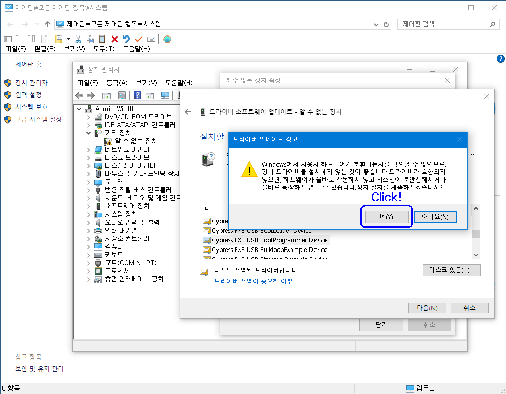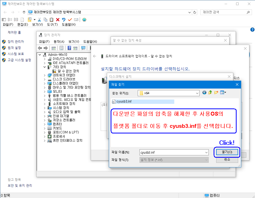 7. 압축을 해제한 폴더에서 사용OS의 플랫폼 폴더로 이동하여 cyusb3.inf 파일을 선택합니다.