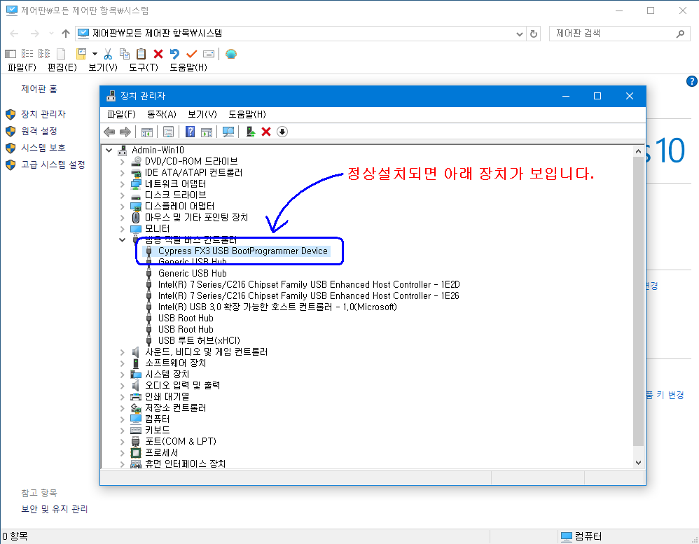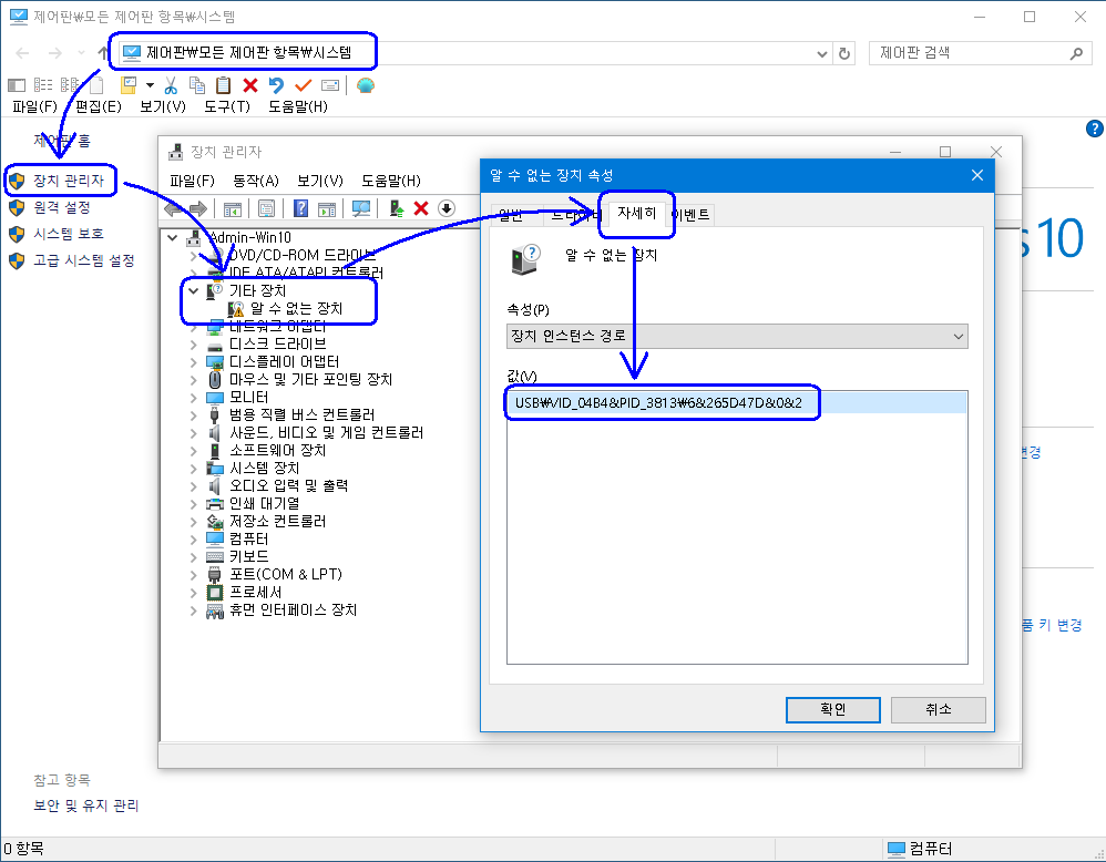USB포트나 롬라이터에 이상이 없다면 윈도우는 VID_04B4&PID_3813 를 표시합니다.