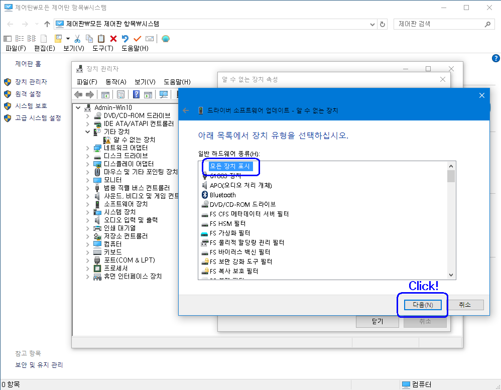 5. 모든 장치 표시 선택 후 [다음] 을 클릭합니다.