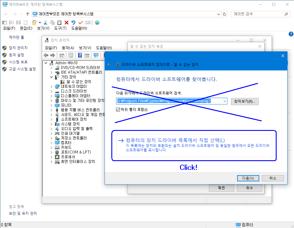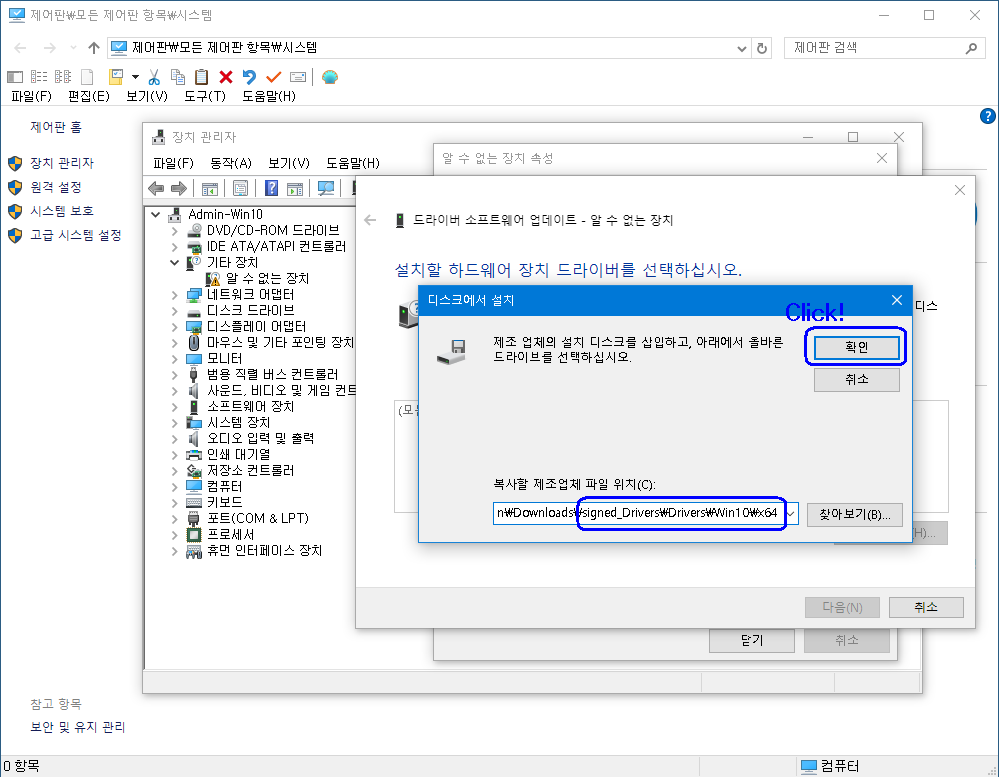 8. 이 예제에서는 Windows 10, 64bit를 선택하였으며 signed_Drivers\Drivers\Win10\x64 폴더가 이동한 폴더가 되겠습니다.