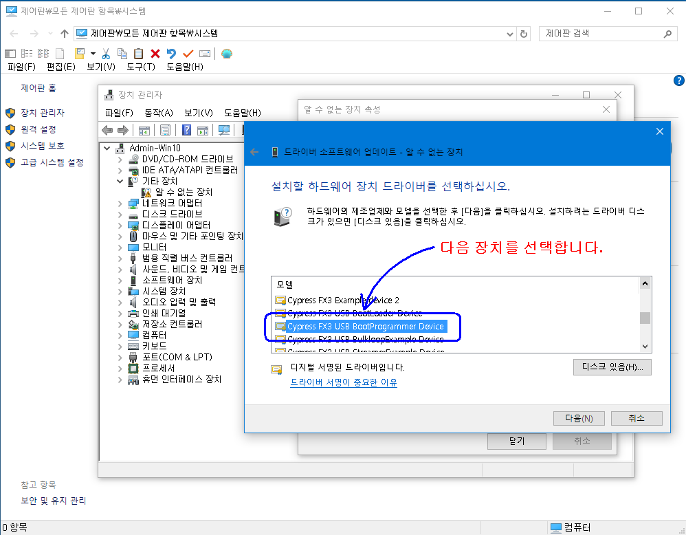 9. 목록에서 Cypress FX3 USB BootProgrammer Device 를 선택하고 [다음] 을 클릭합니다.