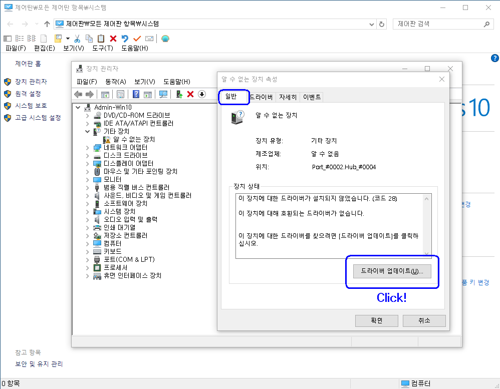 2. 일반 탭으로 이동하여 [드라이버 업데이트] 를 클릭합니다.