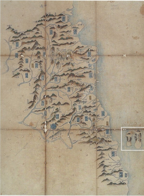 팔도의 도별지도와 만주의 오라영고탑을 합쳐 그린 9장으로 구성된 지도책에 수록된 것으로 강원도의 도별지도에서 울릉도를 그리고 그 서쪽에 우산도(독도)를 표기하였다. 백두산에 정계비가 표시된 점으로 미루어 1696년의 안용복 사전 이후에 제작된 지도인데도 우산도(독도)를 울릉도의 동쪽에 그리지 않고 서쪽에 그린 점이 특이하다.