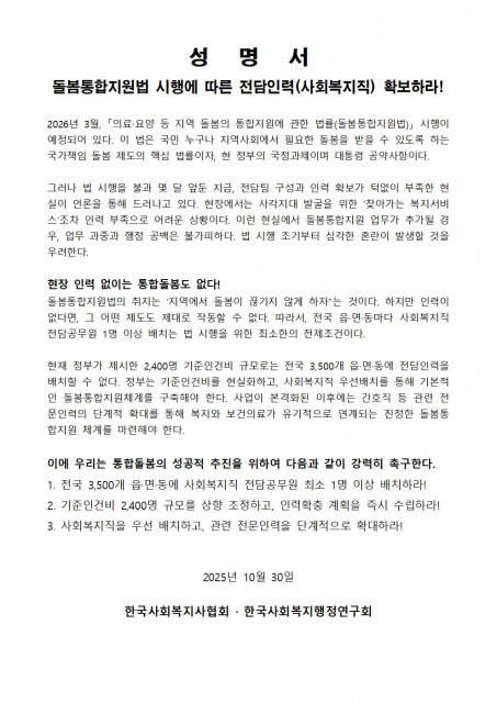 한국사회복지사협회·한국사회복지행정연구회가 돌봄통합지원법 시행에 따른 전담인력(사회복지직) 확보를 촉구하는 공동 성명을 발표했다.