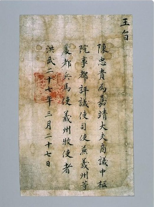 태조 3년(1394)에 진충귀(陳忠貴)에게 내린 의주목사로 임명하는 사령서이다.