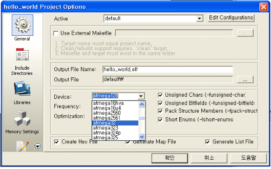 마. 화면과 같이 'Device'에서 ‘atmega32'를 선택하고 'Generate List File'을 체크하고 확인 버튼을 누른다.