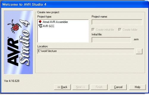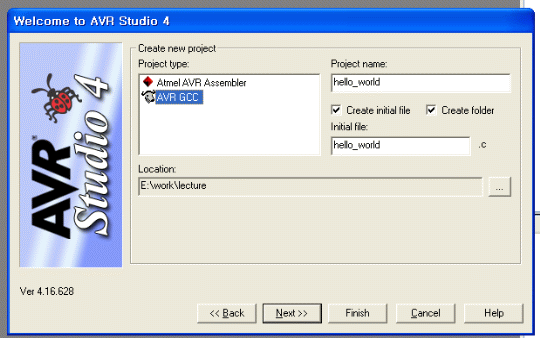 다. ‘Project type‘에서 'AVR GCC'를 선택, 'Project name'에 'hello_world'를 입력하고 'Finish' 버튼을 누른다.