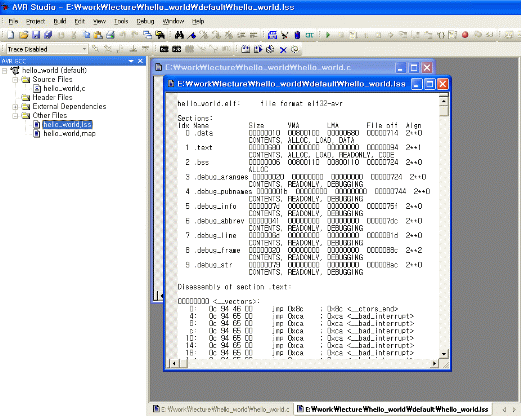 ‘마’에서 선택한 ‘Generate List File'이 ’아‘에서 열기한 ’hello_world.lss' 파일을 생성하여 준다. 본 파일은 실제 생성된 실행 파일을 어셈블리로 변환하여 C코드와 같이 배치를 하여 보여준다. 자세한 내용은 나중에 설명하도록 하겠다. 최종 실행 파일은 프로젝트가 생성된 폴더에서 ‘default' 폴더에 'hello_world.hex'로 생성되어 있다.