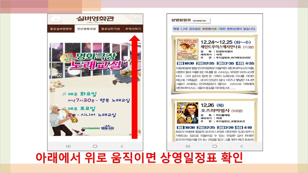 ※ 스마트폰으로 영화 시간표 확인하는 방법 (실버영화관 설치) 작성자명화극장|작성시간19.12.24|조회수436 목록 댓글 0 글자크기 작게가 글자크기 크게가 다음검색 현재 게시글 추가 기능 열기 북마크 공유하기 신고 센터로 신고 댓글 댓글 0 댓글쓰기 답글쓰기 댓글 리스트