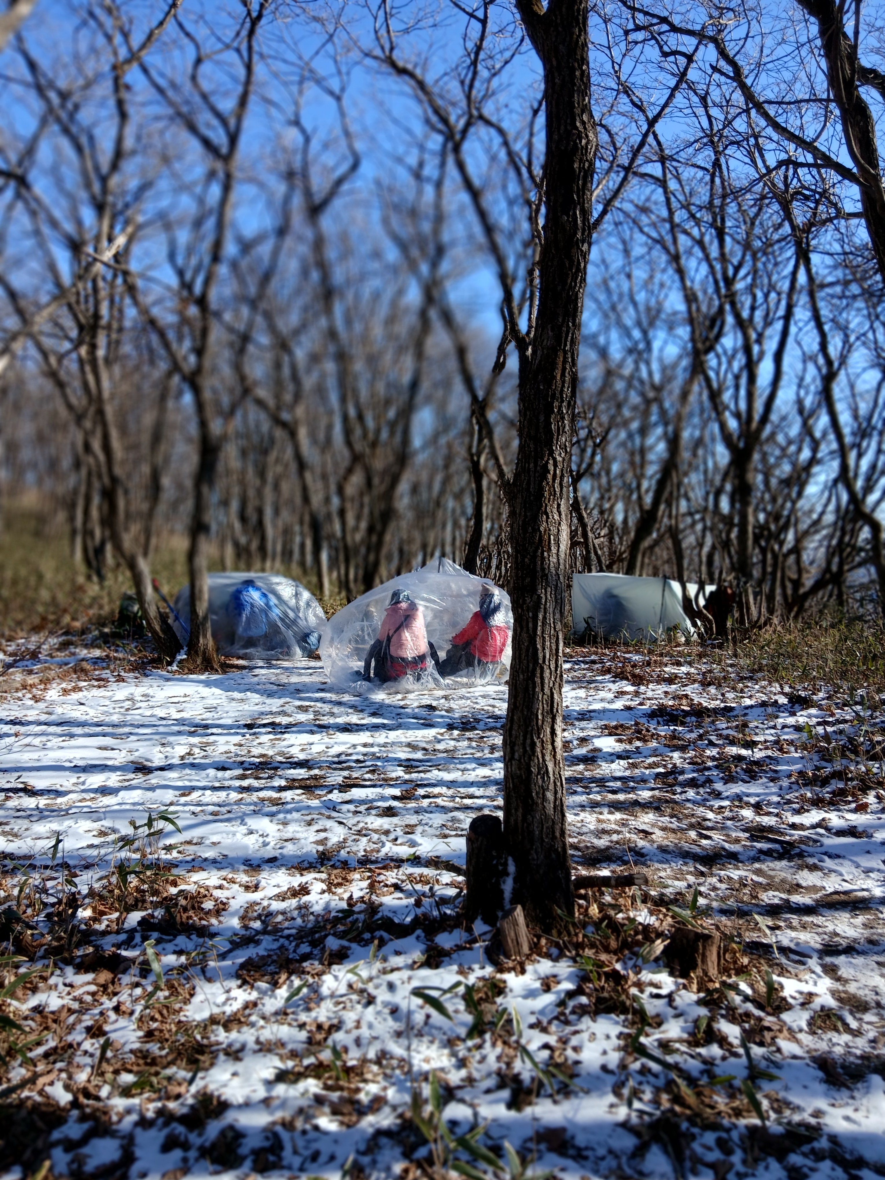추운데도 비닐 한장에 의지하여 식사하는 모습 입니다
