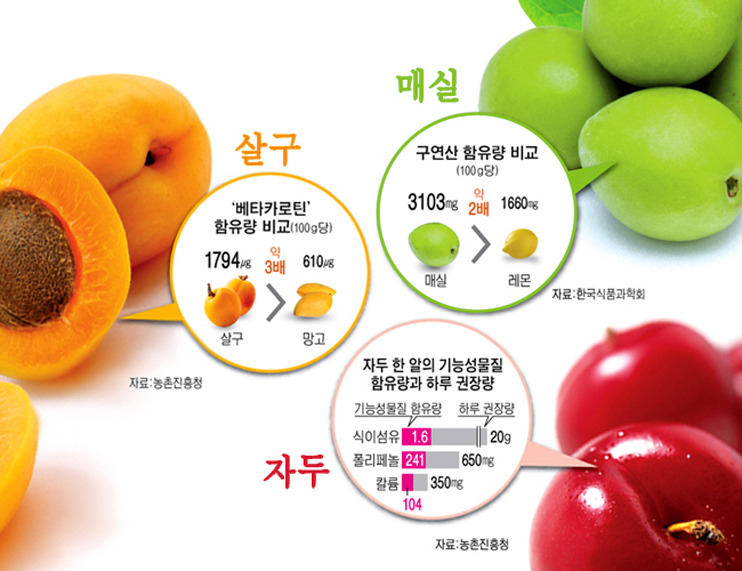풋매실보다 과육이 조금 숙성된 매실이 마그네슘,구연산,피크린산이 많이 나오며,과육과 씨앗에