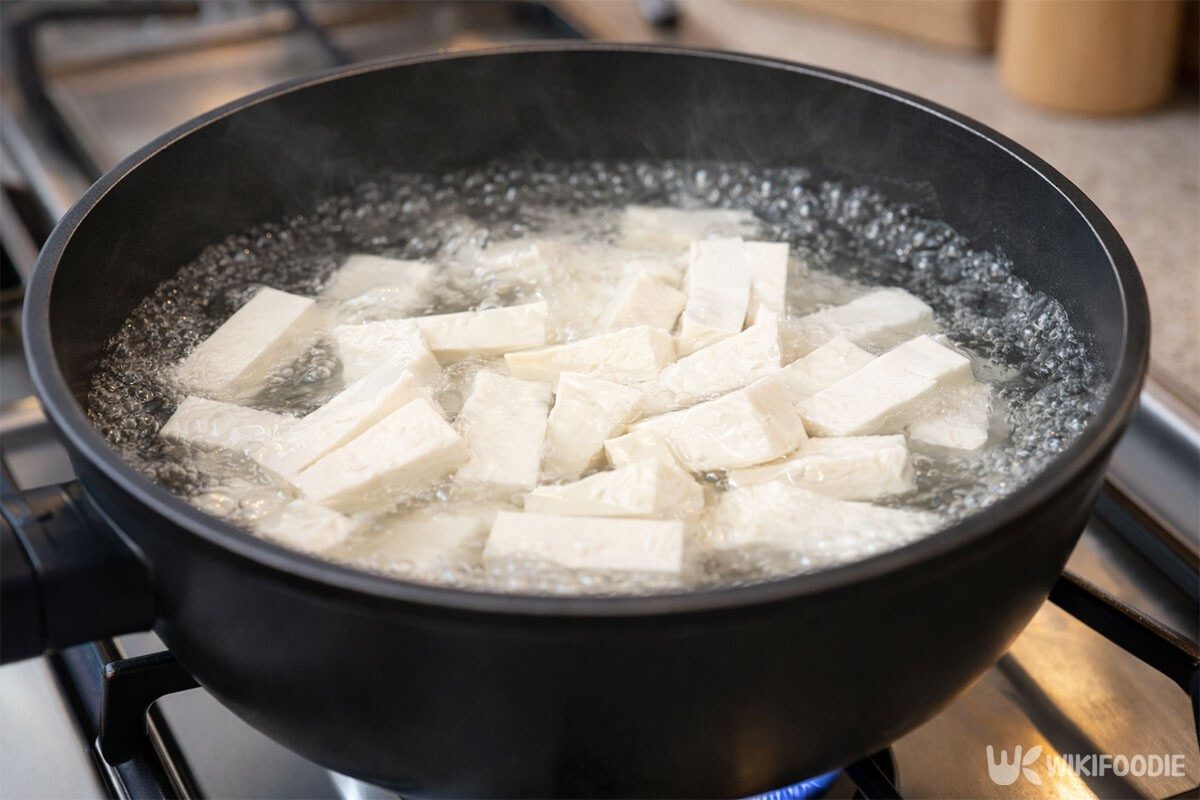 냄비에 물 700mL를 넣고 센 불에서 팔팔 끓인다. 이때 국물의 깔끔함을 유지하기 위해 다른 육수 재료를 넣지 않는 것이 비결이다. 물이 힘차게 끓어오르면 썰어둔 두부를 넣는다.