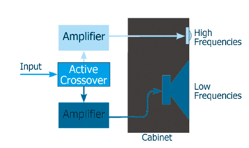 액티브 방식이라고 해도 크로스오버 회로의 동작 원리는 패시브 방식과 다를 바 없지만 큰 차이점은 각 스피커 유닛에 맞는 앰프가 별도로 사용된다는 것이다. 두 개의 스피커 유닛이 사용되는 2웨이 방식으로서, 입력되는 신호를 액티브 크로스오버 회로를 통해 주파수 대역을 분리하고 각 대역별로 신호를 증폭하는 앰프가 따로 사용된다. 하나의 앰프가 아닌 두 개 이상의 앰프로 스피커를 구동하는 방식을 바이앰핑bi-amping 또는 멀티 앰프 구조라고 하는데, 앰프를 스피커 유닛 특성에 정확하게 일치하게 설계할 수 있기에 더 좋은 소리를 들려주게 된다.