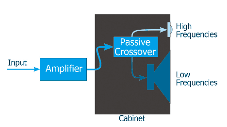 컨덴서와 저항, 인덕터(코일)의 수동 소자로 구성된 패시브 크로스오버 회로가 장착된 스피커를 패시브passive speaker 스피커라고 부른다. 가장 흔하게 볼 수 있는 스피커 구조이며 패시브 크로스오버 회로는 파워 앰프에서 전달받은 음을 고음과 저음의 주파수 영역으로 분리하여 서로 다른 유닛에 공급하는 역할을 한다.