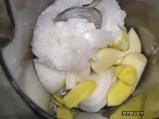 양파, 마늘, 생강, 걸죽한 찰밥을 믹서 해 주세요.