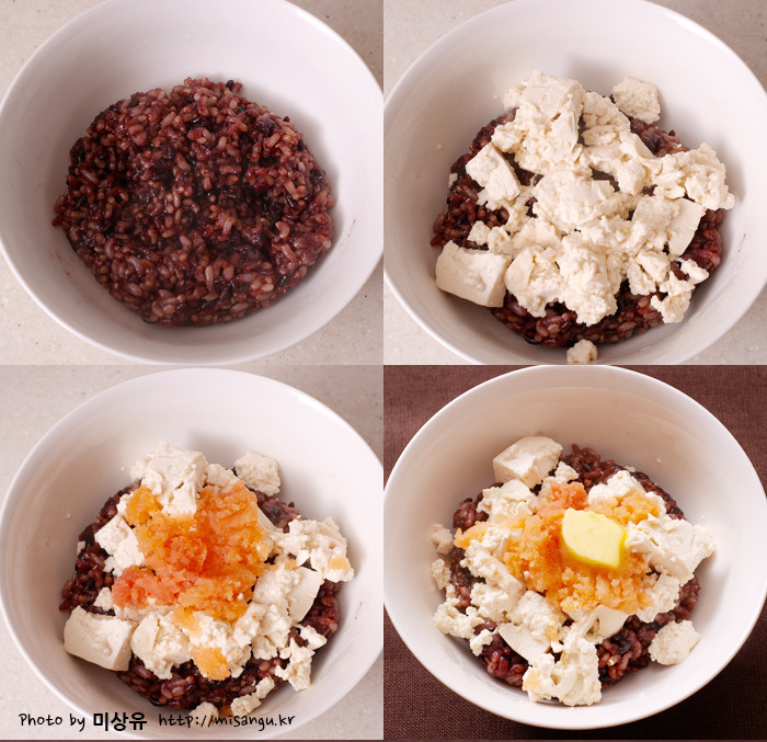 재료: 밥 1공기, 두부 1/2모, 명란젓 약간, 버터 1작은술, 쪽파 다진 것 약간, 쯔유(혹은 간장) 약간