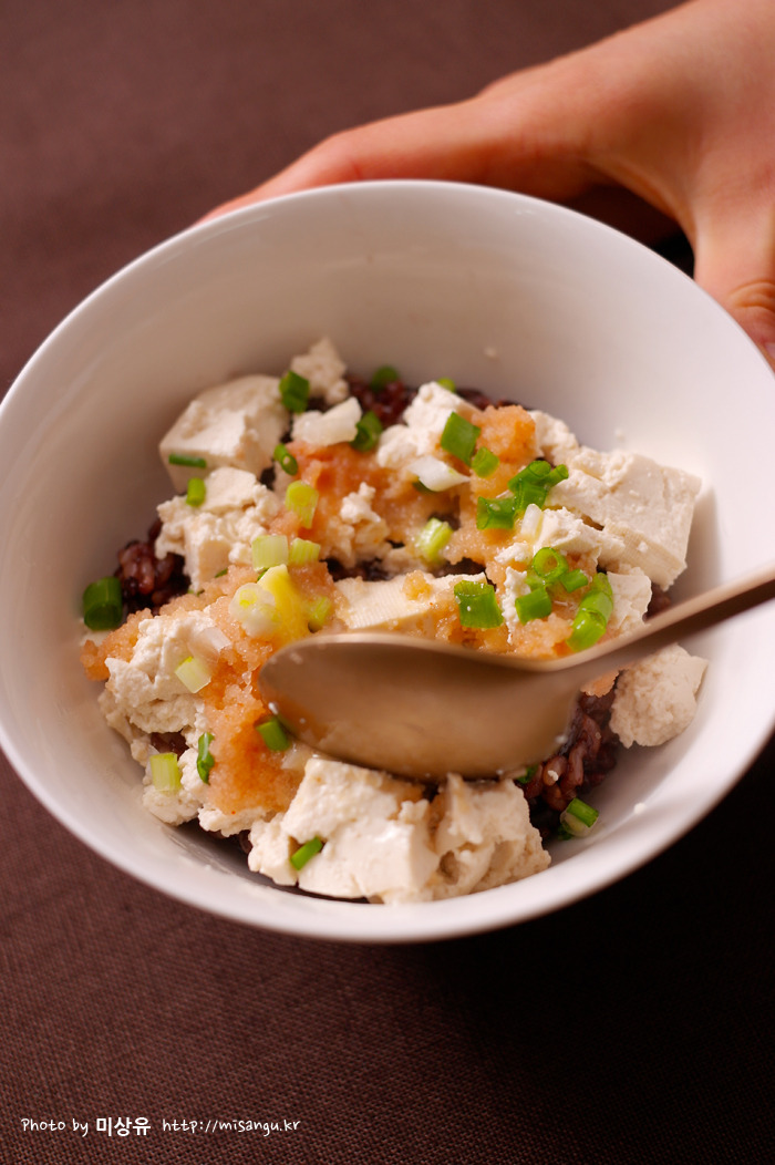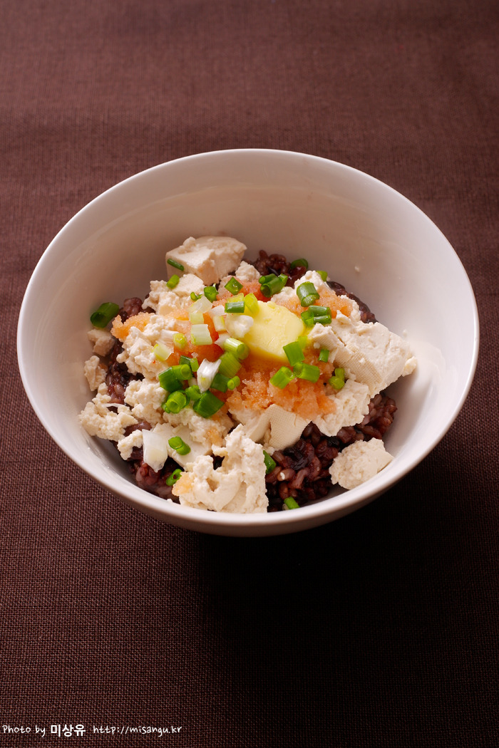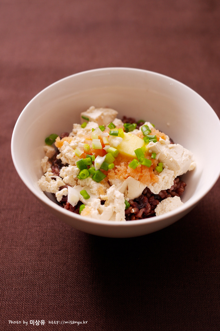 따뜻한 밥 - 데쳐 으깬 두부 - 막을 제거한 명란젓 - 버터 올려 전자렌지에 1분 돌린 후 쪽파와 쯔유를 뿌려 먹습니다.