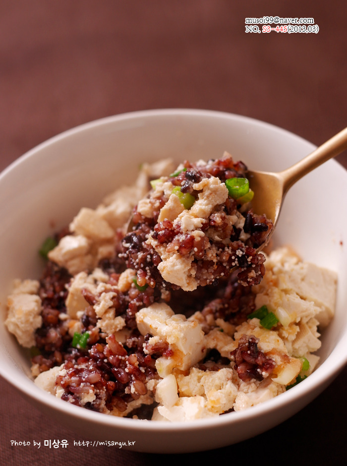 2. 두부를 살짝 데쳐 약간 으깬 후 위에 올립니다.