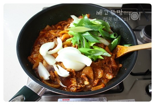 그리고 채썬 양파 1/2개, 어슷썬 대파 1대를 넣고 볶아 줍니다.